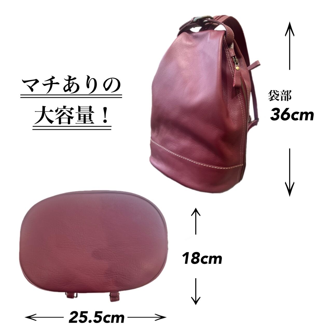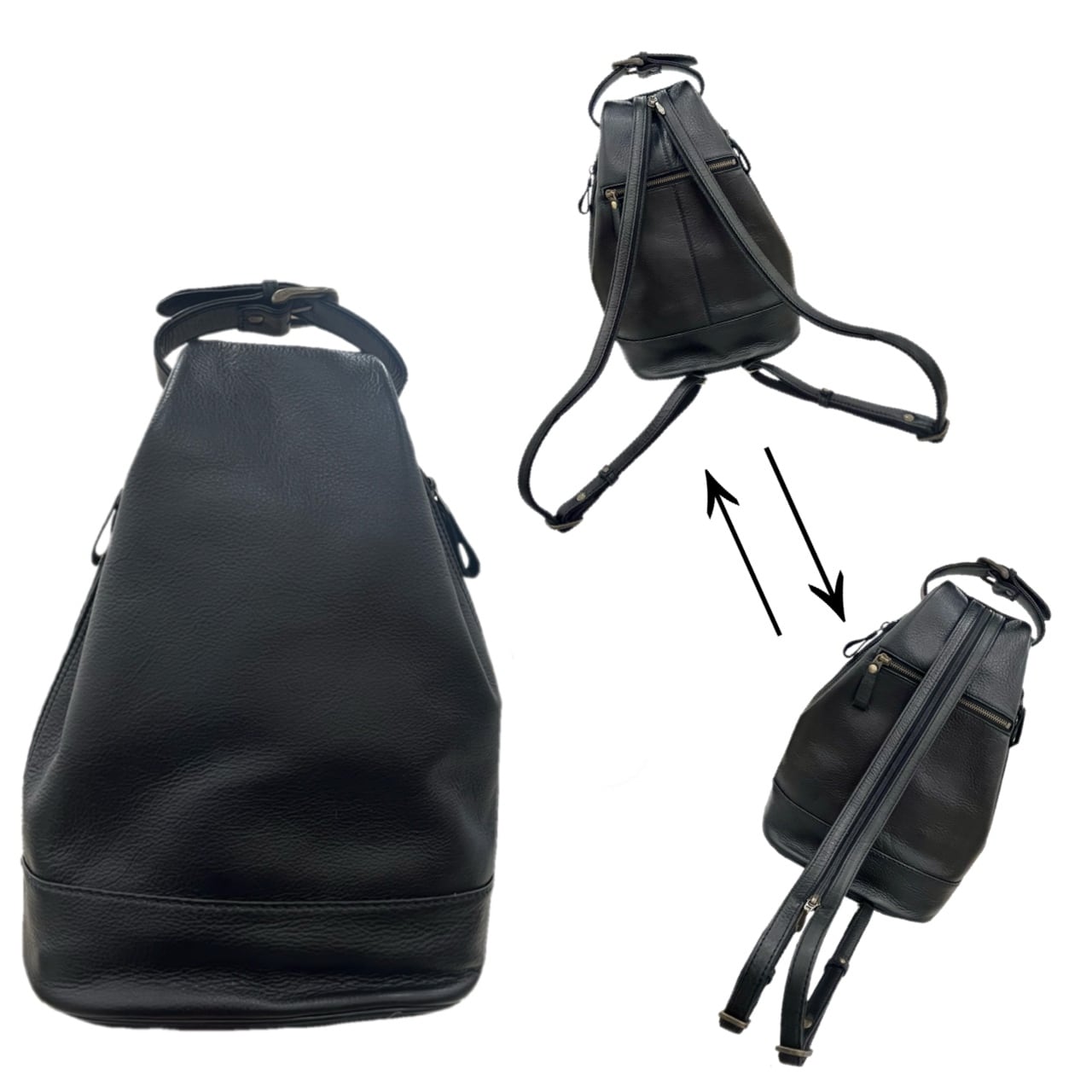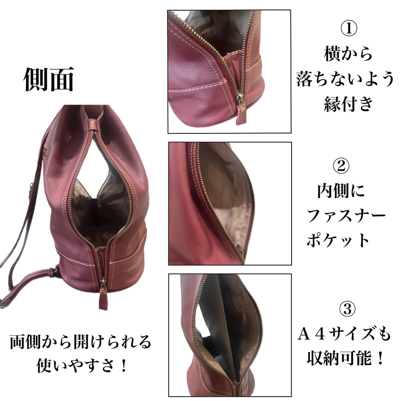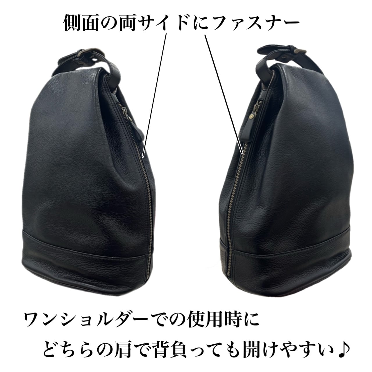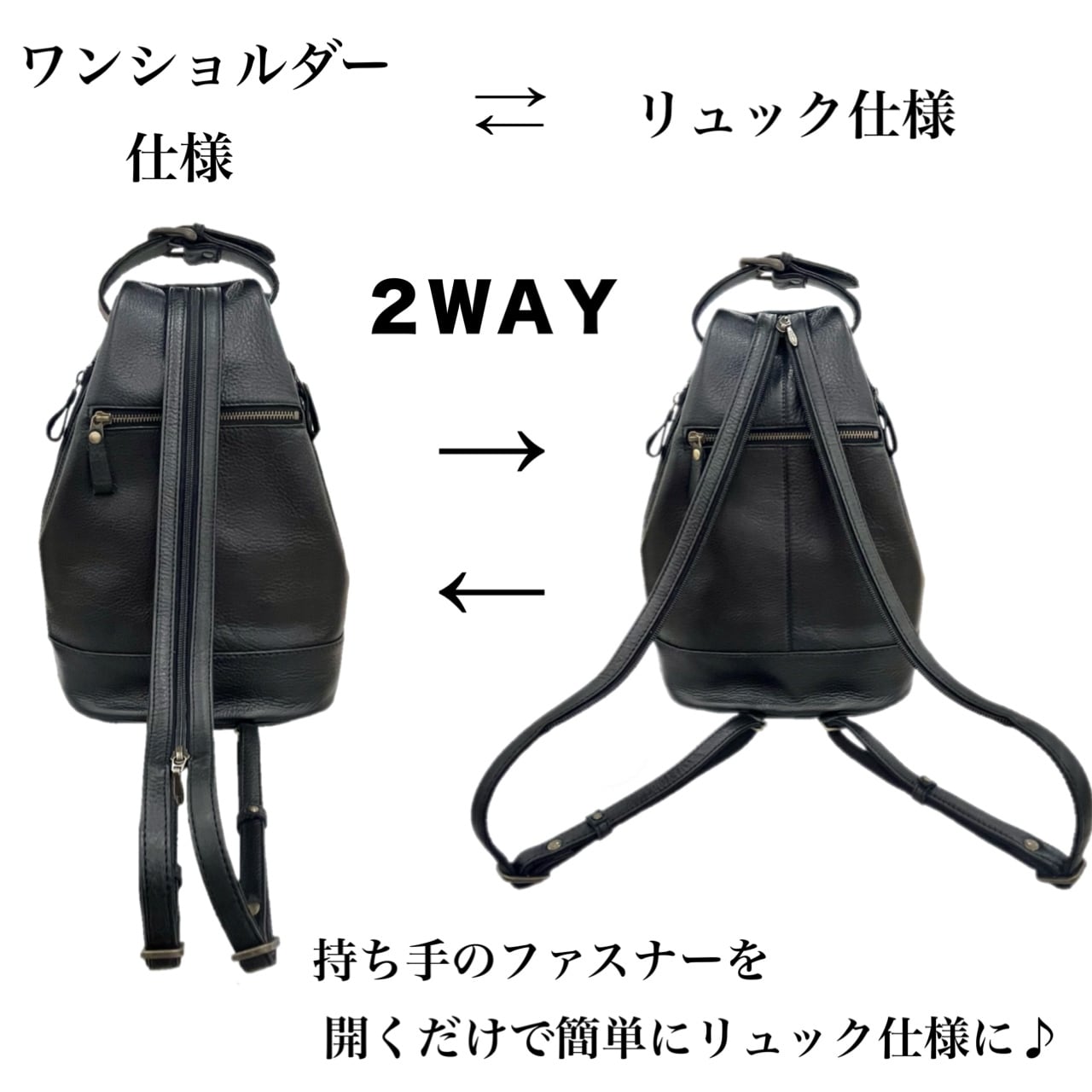 ベルト部のファスナーの開閉により、リュックにもワンショルダーバッグにもなる本革バッグ。