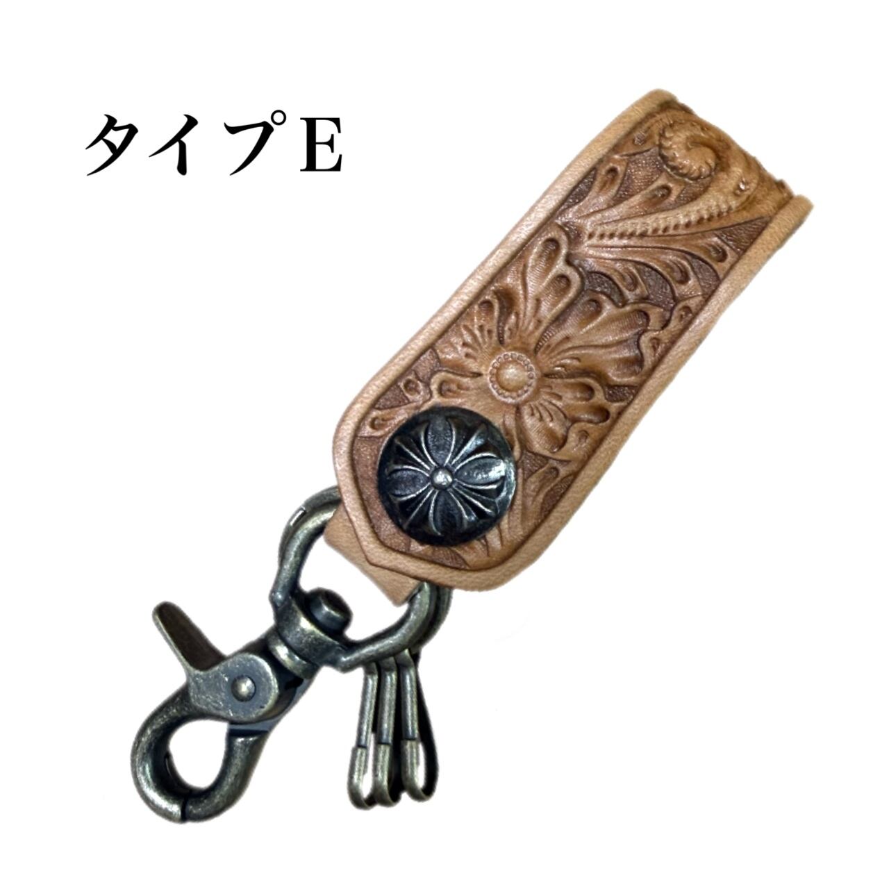 ヌメ革に様々な絵柄を彫り、色付けを施したキーリングです。革を少し染めることとコンチョの組み合わせでアンティーク感を出しております。