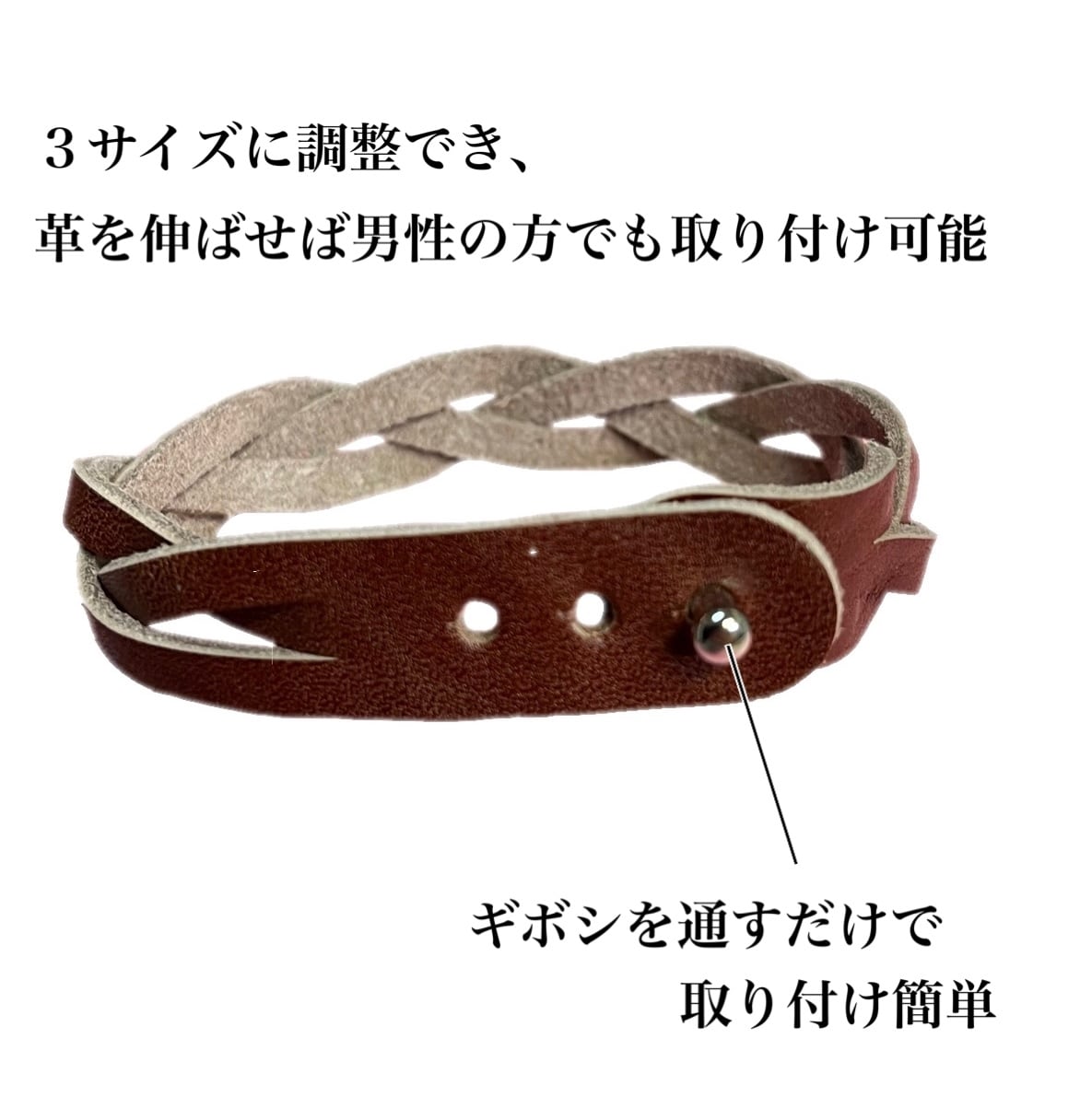 3段階調整できますが、革の柔らかさを利用して伸ばすと男性の方でも身につけることができます。